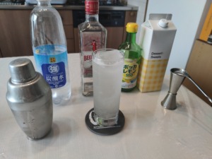 身近な材料でも作れるか試してみました。レモン・ジュースはポッカレモン、砂糖は業務スーパーのガムシロップで代用、ソーダはドンキの強炭酸水(飲みかけ)という、なかなかリアルな家庭調製です。酸味はシェークによってやわらかくなじんでいて、甘みとのバランスも悪くありません。ただ、炭酸が少し弱くなっていたのが惜しいところ。フィズ系カクテルはソーダのコンディションが仕上がりを大きく左右するので、できれば開けたての強炭酸水を使うのがおすすめです。暑い夏には、こういったスッキリした一杯がよく似合います。