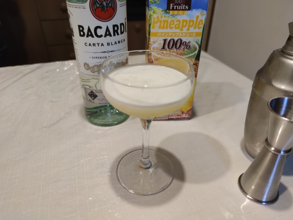今回もバカルディのホワイトラムを使っています。シュガーシロップを入れるレシピになっていますが、甘すぎないようにと思い、今回は入れていません。軽く長めにシェイクして、材料同士を十分に混ぜ合わせ、さらに泡の層を作るように調製しました。