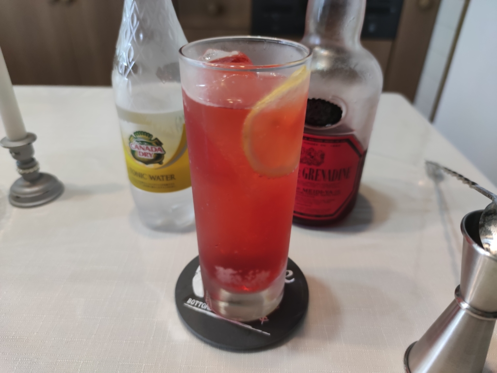 グレナデンシロップとトニックウォーターを使ったノンアルコールカクテルです。今週末は妻がアルコール禁止(ドクターストップ)になってしまったので・・・。