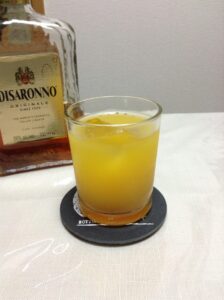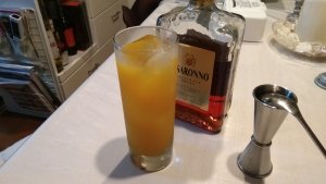 妻の晩酌用に調製した一杯です。スクリュー・ドライバーのウォッカをアマレットに替えただけのシンプルなレシピですが、アルコールをほとんど感じないくらい飲みやすい仕上がりになります。市販の濃縮還元オレンジ・ジュースでも十分においしいのですが、絞りたてのフレッシュ・オレンジ・ジュースを使うとさらに一段おいしくなりますね。