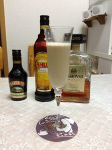 使用銘柄はベイリーズ・アイリッシュ・クリーム、カルーア、ディサローノ・アマレット、生クリーム、ミルクです。今回はおしゃれにフルートグラスに入れてみました。