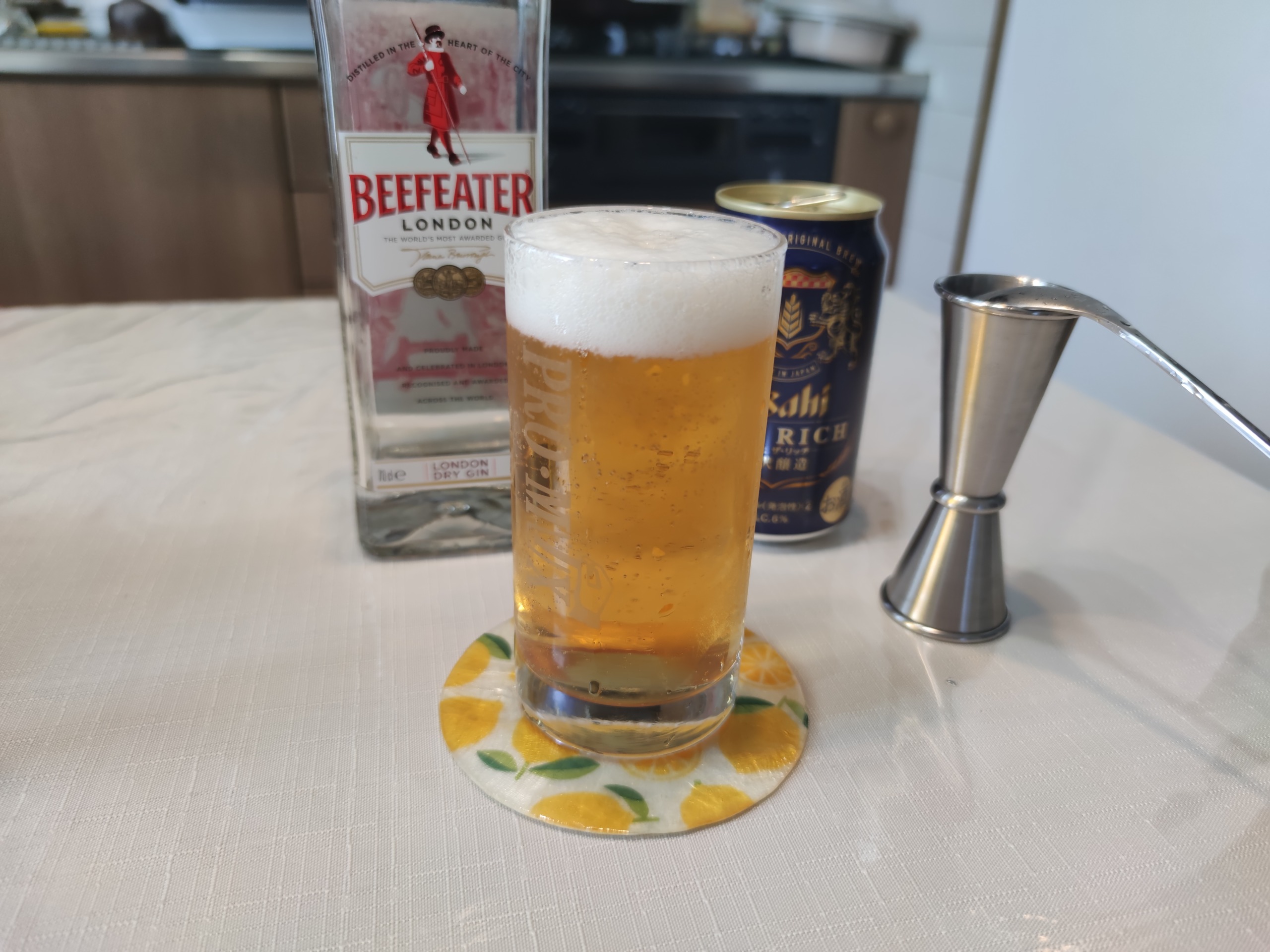 今回はロングドリンクのレシピで調整しました。ライチリキュールに「ディタ」、ブルーキュラソーはボルス、グレープフルーツジュースとトニックウォーターは昨日の残りを使用しました。ブルーキュラソーは通常レシピだと10mLなのですが、少々多い感じがしましたので、1tspに変更しています。