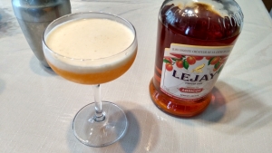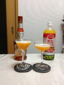 ルジェのクレーム・ド・アプリコットを使って調製しました。甘みが強くフルーティーで、アプリコットとオレンジの香りが口の中に広がります。私はビターズなし派で、その方が甘さが素直に出て飲みやすいと思っています。
